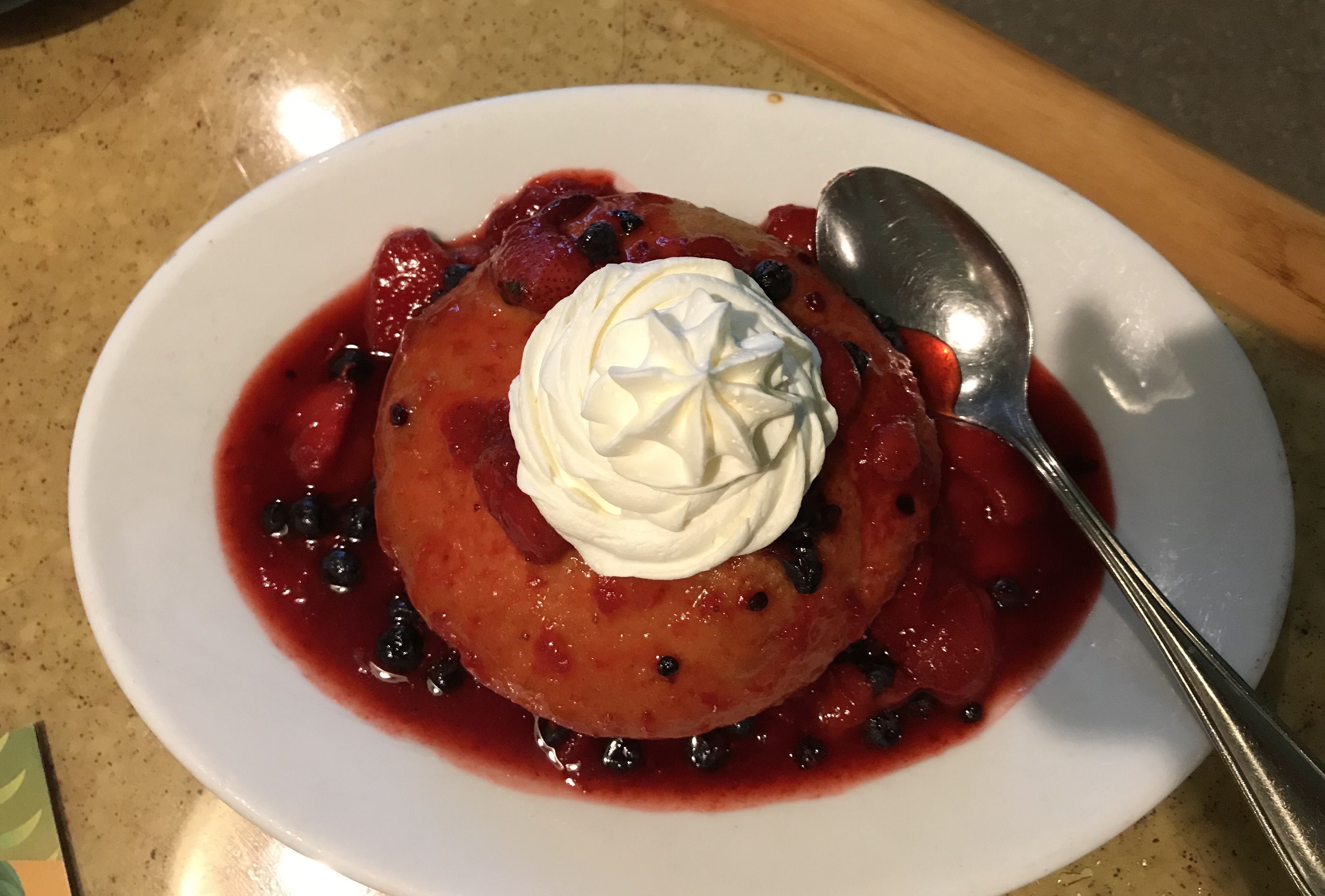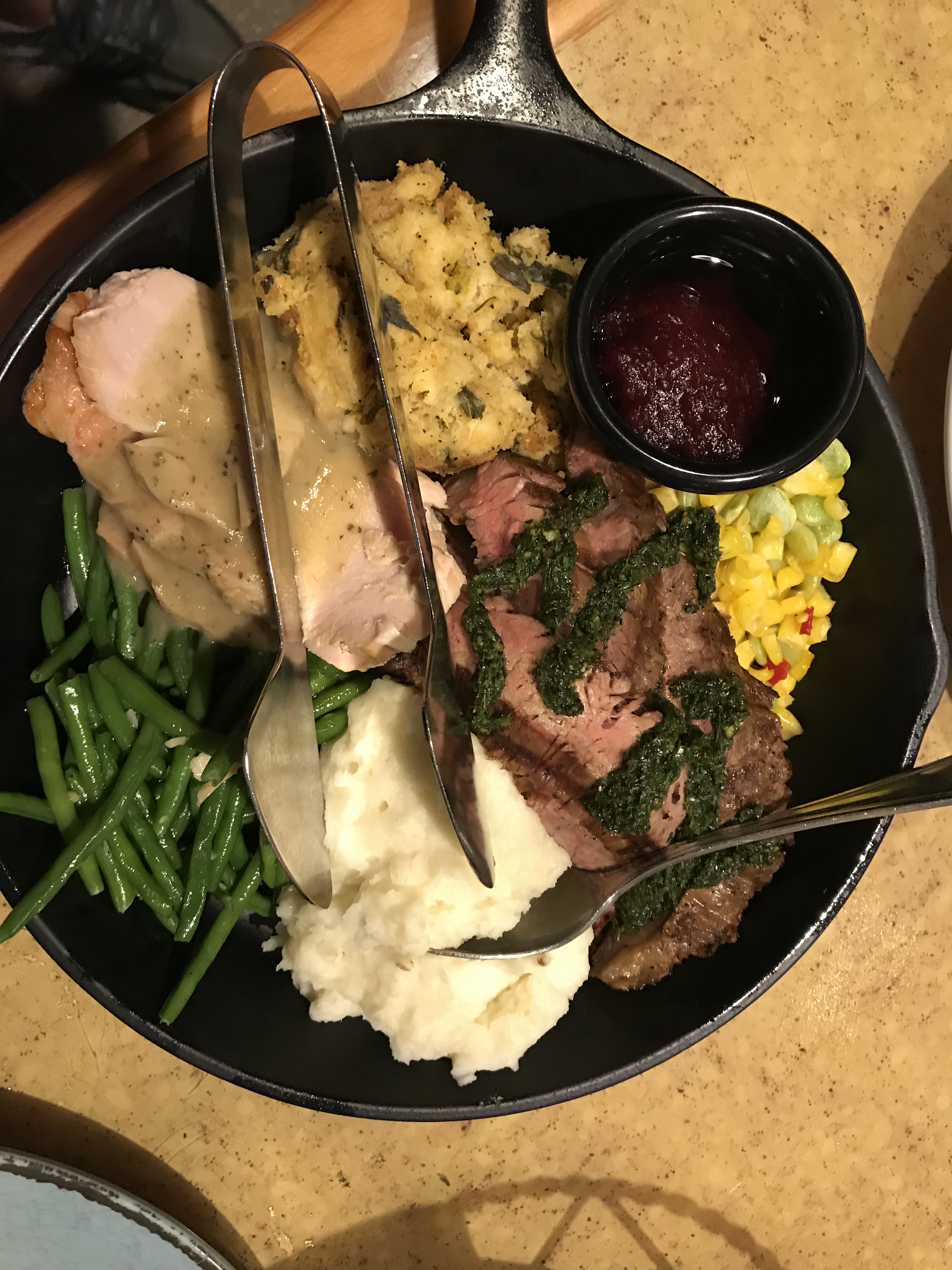 This meal features family style dining with steak, turkey stuffing, potatoes, bread, salad a delicious fruit covered pound cake and more!