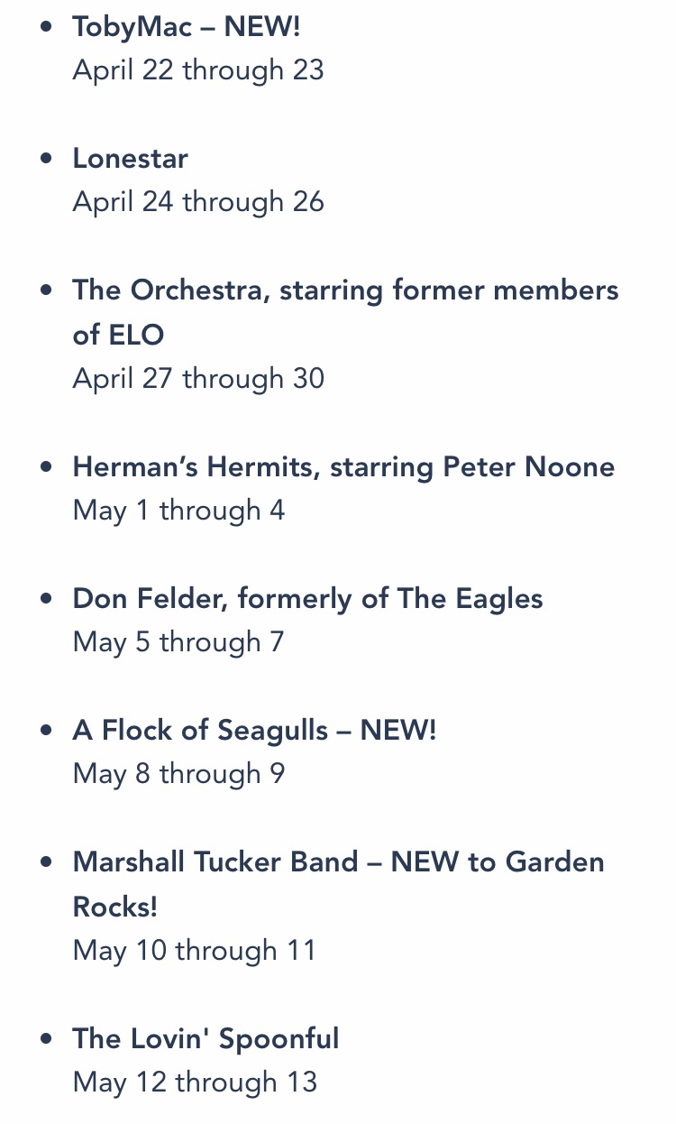 Among the free offerings is the Garden Rocks Concert Series. Flock of Seagulls performed while I was there. Other acts included Herman’s Hermits, Lonestar, Dennis DeYoung of Styx, Rick Springfield and Journey.