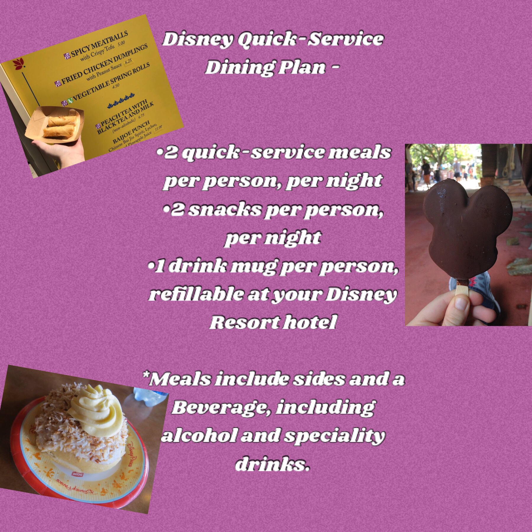 Today, I’m going to focus on the Quick Service Plan. This plan is perfect if you are on a budget or if you enjoy more flexibility in your vacation and don’t want to make advanced reservations for dining.