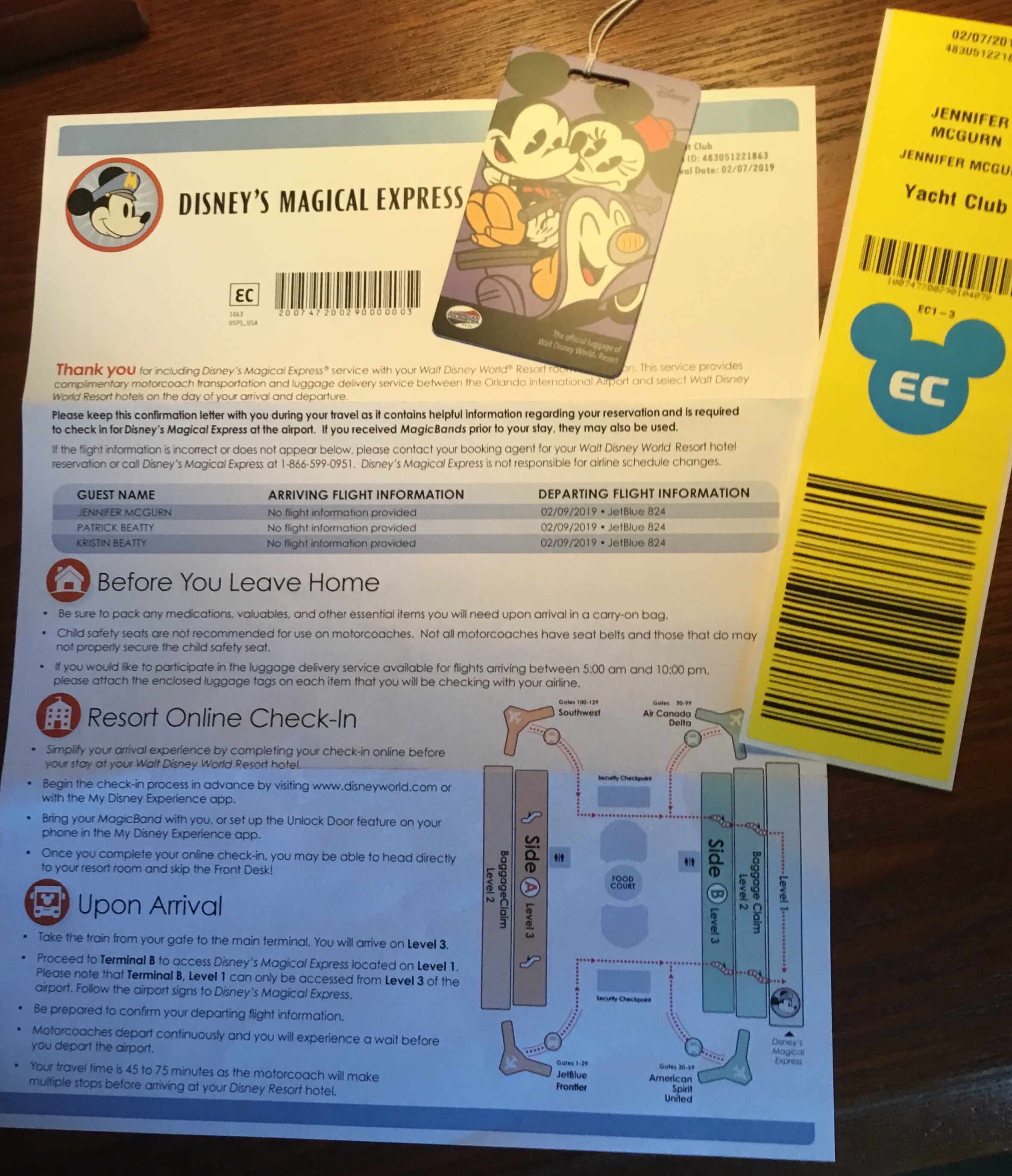 About 30 days prior to your vacation you will receive a letter with everything you need to know for finding your Magical Express bus plus luggage tags for all checked luggage. The yellow ones simply peel and stick. The Character tags are complimentary keepsake tags.