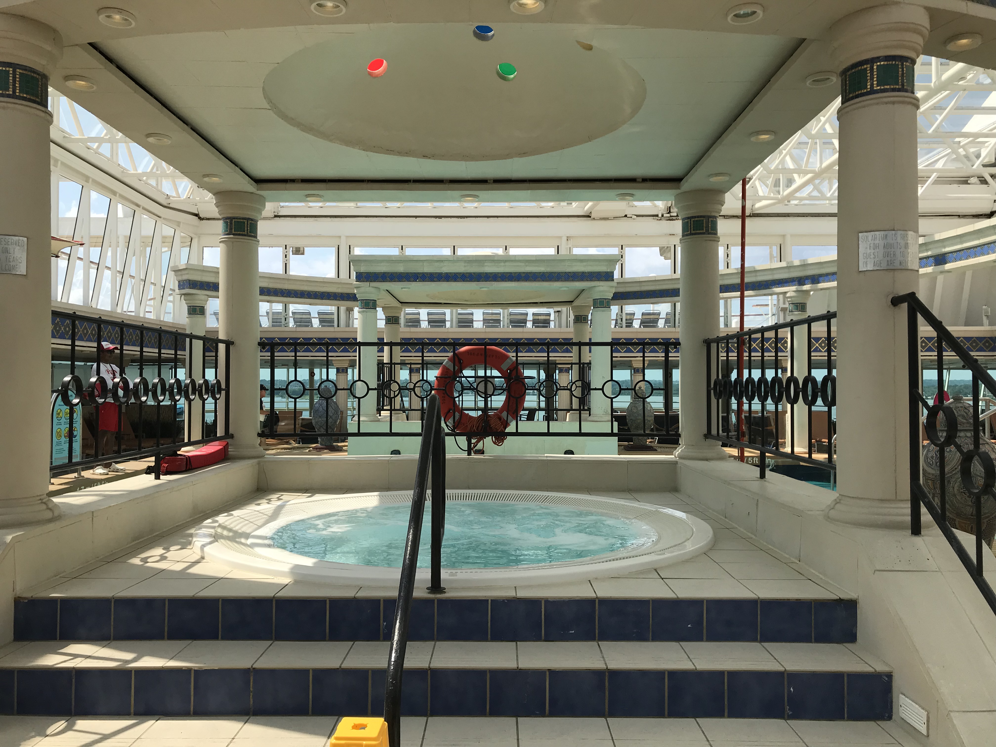 During the day, families can lounge at the pool and adults can enjoy the adults only solarium. This area has a pool, 2 hot tubs, a retractable glass ceiling and a bar of its own.