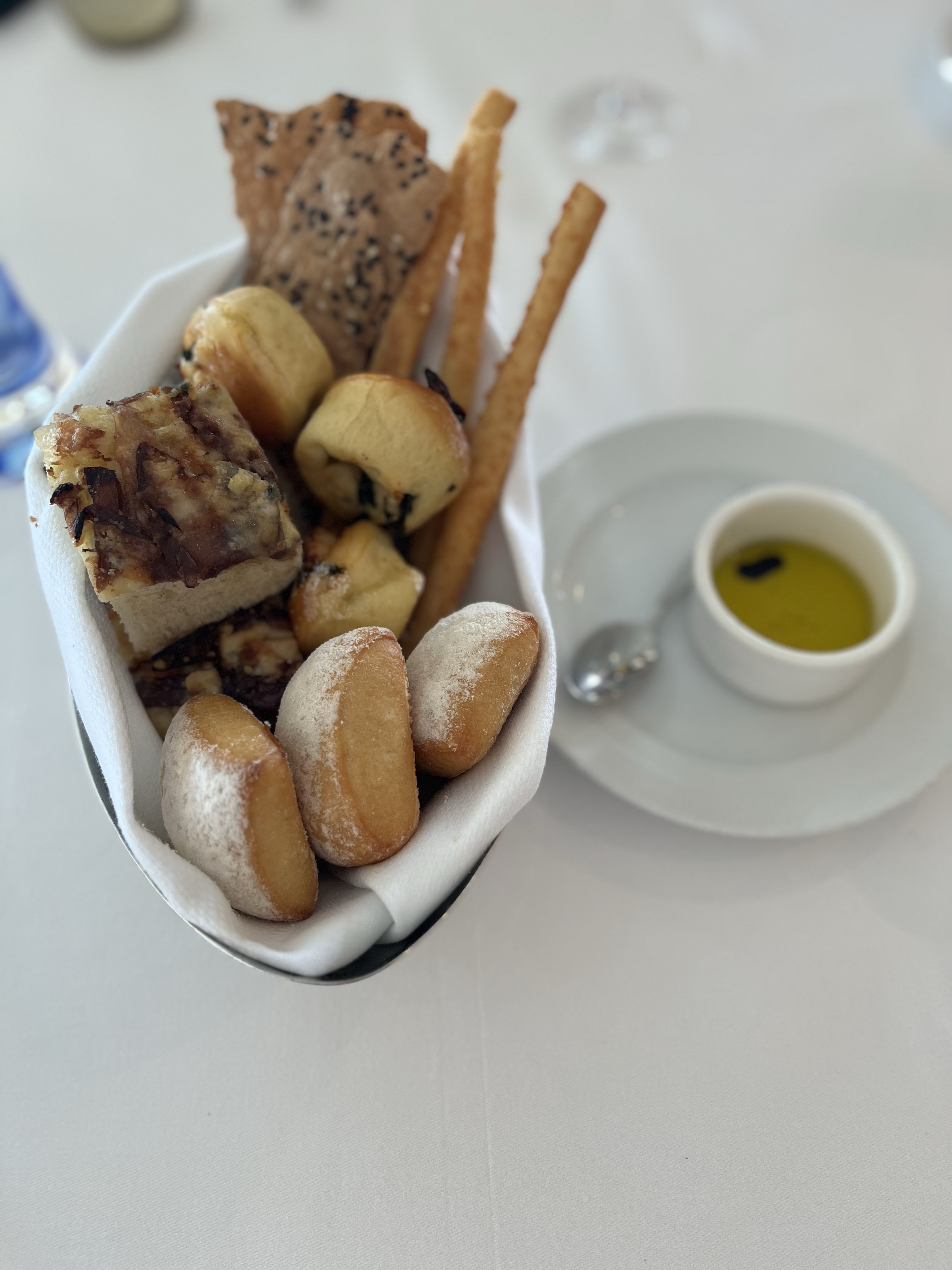 The dining experience includes a welcome drink, sodas, coffee and several courses. From the bread basket to the Goat Cheese Flatbread (big enough to share!) to the generous Main portions and decadent desserts, this was absolutely our favorite meal!