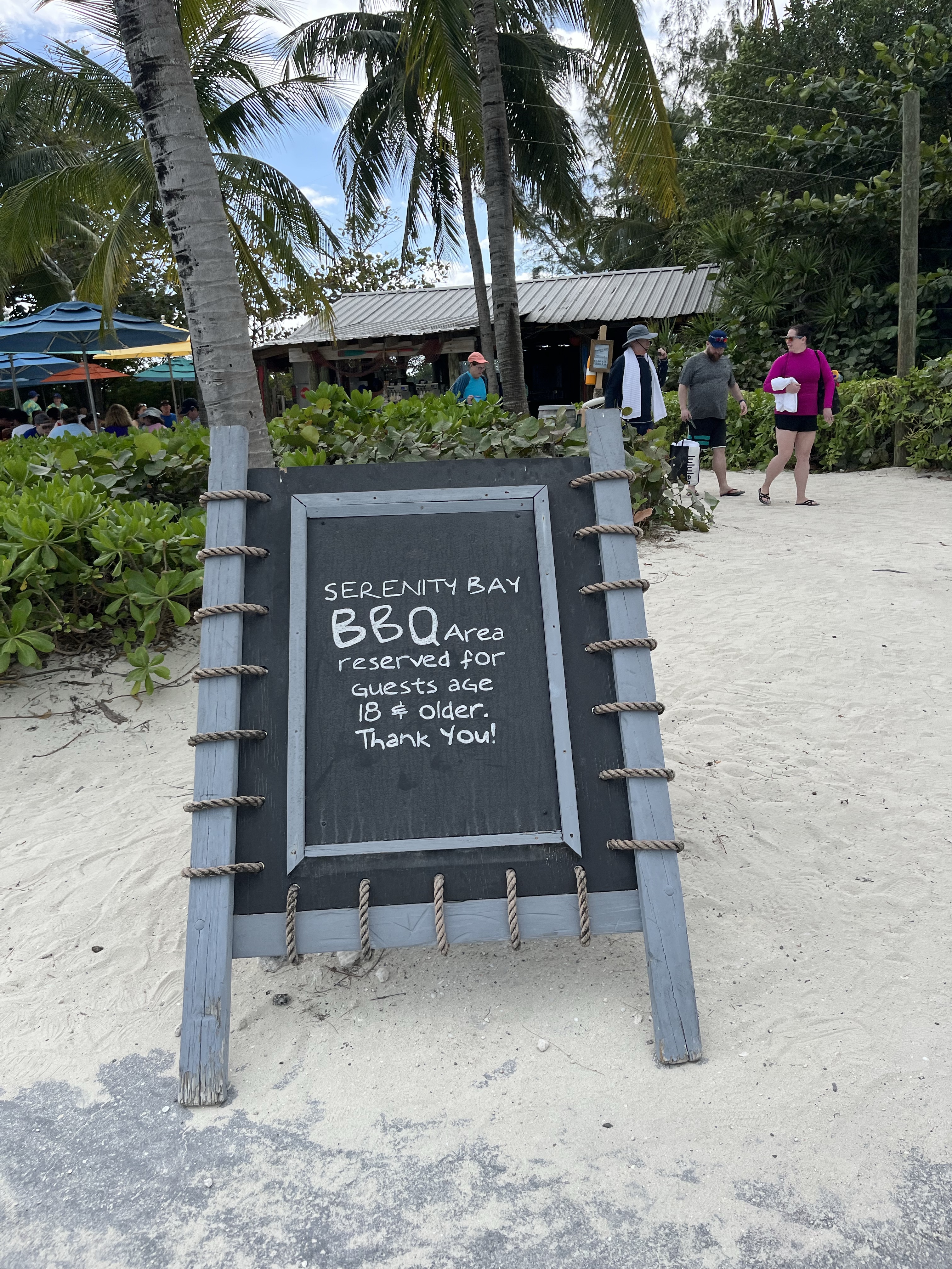 One of the best things about a Disney Cruise is a stop at their private island, Castaway Cay. Even Castaway Cay has an Adult Only space, Serenity Bay. Serenity Bay has its own buffet, as well as a bar and plenty of beachfront lounge chairs. There are also private cabanas available to rent for the day.
