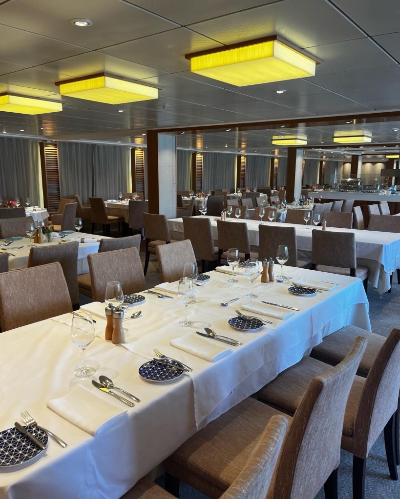 All meals are served in the main dining room or the Aquavit terrace. You will be dining with other guests, unless you choose one of the few tables for 2 on the terrace. We enjoyed this aspect of the cruise as it gives you the chance to meet your fellow sailors, but if that doesn’t appeal to you, you can dine on the terrace.